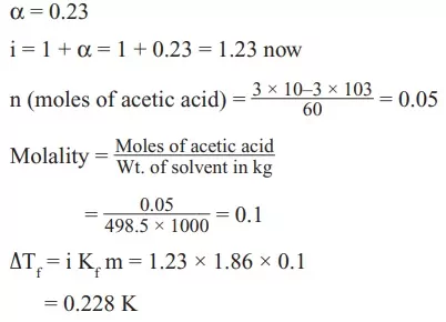 Que 9. To 500 cm3 of water, 3.0 × 10–3 kg of acetic acid is added. If 23% of acetic acid is dissociated, what will be the depression in freezing point? Kf and density of water at 1.86 K kg–1 and 0.0997 g cm–3 respectively.