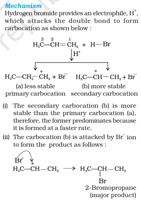 Que 4. Write the mechanism of the addition reaction of Propene with HBr in the presence or in the absence of organic peroxides.
